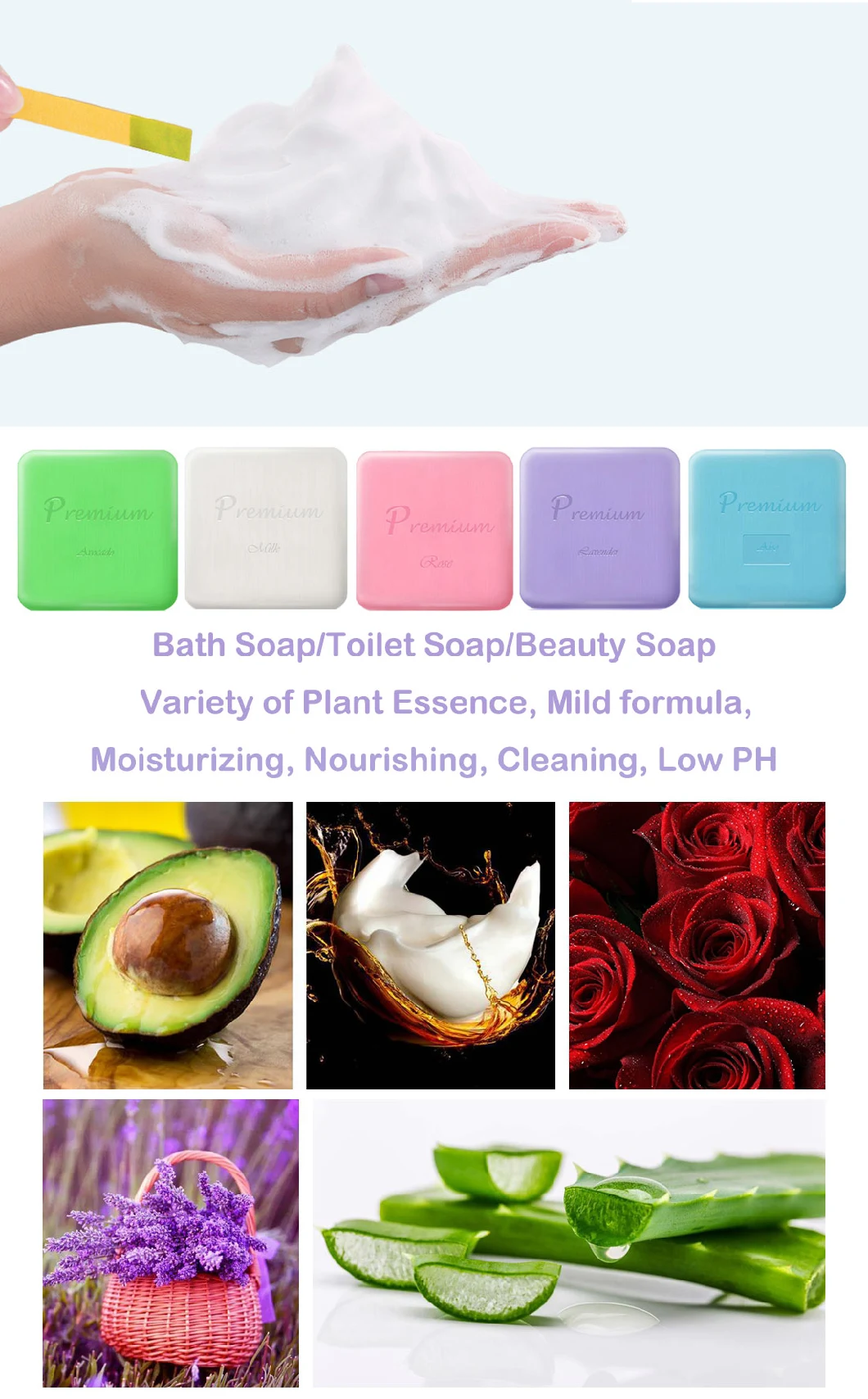 Product:Bath Soap/Toilet Soap/Beauty SoapWeight60g, 100g, 150g, 200gSuitableAll SkinFragrance:Lemon, Orange, Lily, Lavender, Jasmine, Aloe, etc.Color:White, Pink, Green, Yellow, Blue, Purple or CustomizedIngredient:Glycerin, Shea butter, olive oil, grape seed oil, coconut oil, ionic water, Goat milk extractPacking:Individually p